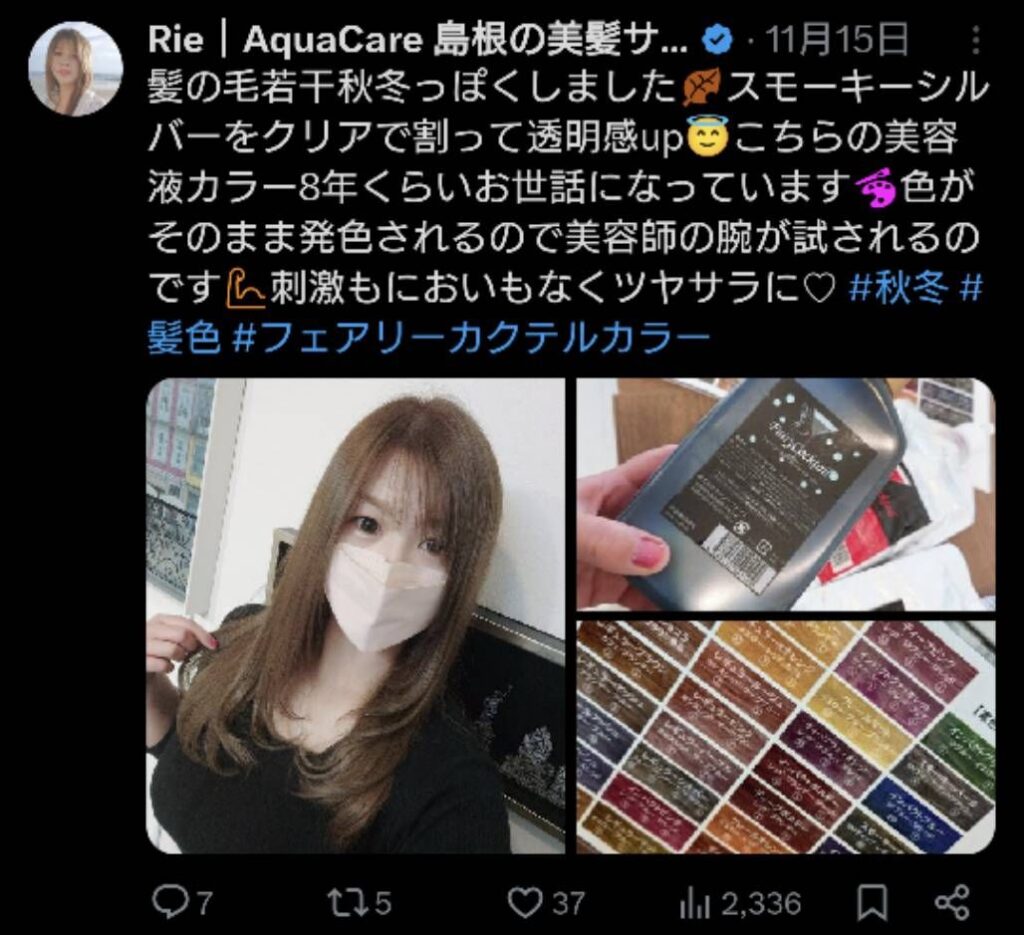 先日、自分で染めた写真と一緒に「フェアリーカクテルカラー」という美容液カラーの投稿をX(旧Twitter)の方にあげたのですが、それを見てくださったお客様から「これはなんですか?」とご質問をいただきました😊見ていただけて嬉しいし有難いです♪