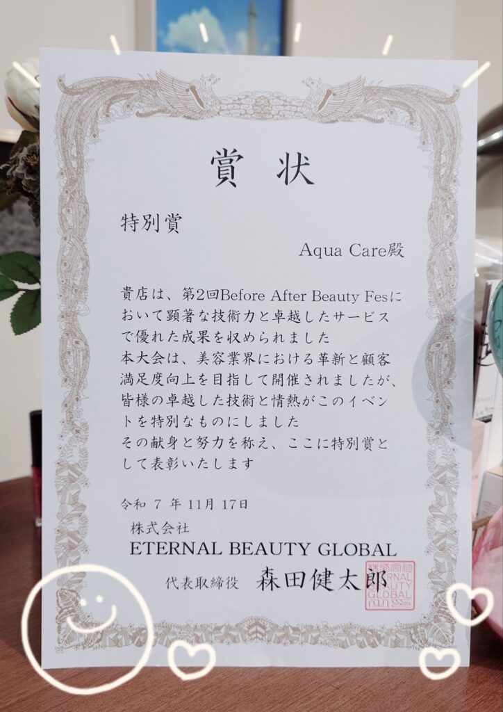 11月にエクソソームのメーカーさん主催のビフォーアフターコンテストが開催されたのですが、アクアケアが『特別賞』をいただきました(*^▽^*)✨